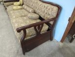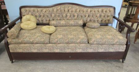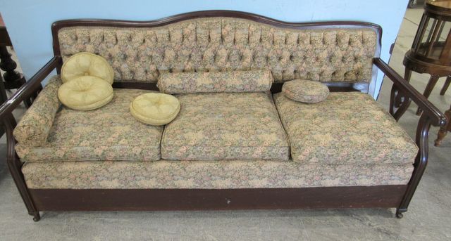 Three cushions, hide away bed, carved arms, camel back, tufted fabric back, 78"w., 36"h., 26"d. Three cushions, hide away bed, carved arms, camel back, tufted fabric back, 78"w., 36"h., 26"d.