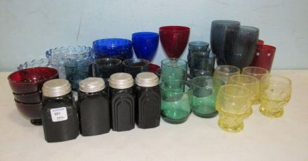 Cobalt blue stem, bowls, Ruby red stem, cups, Red glass salt & peppers, green cups, light blue whitehall bowls, yellow cups, purple glasses. Cobalt blue stem, bowls, Ruby red stem, cups, Red glass salt & peppers, green cups, light blue whitehall bowls, yellow cups, purple glasses.
