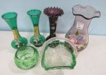 Pair of hand painted Japanese vases 7"h., Green cut glass votive 3"h., hand painted vase 8"h., crimped top hand painted vase 7"h., hand blown basket. Pair of hand painted Japanese vases 7"h., Green cut glass votive 3"h., hand painted vase 8"h., crimped top hand painted vase 7"h., hand blown basket.