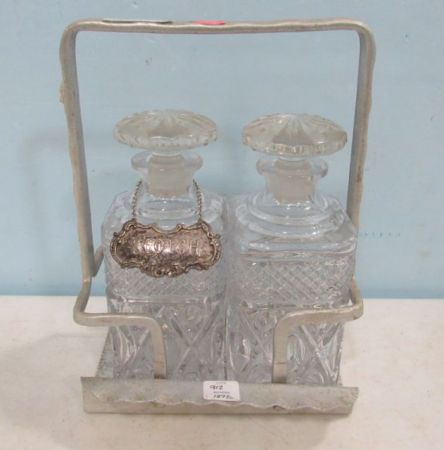 Pressed glass liquor decanters, metal carrying case, 11"h., 8"w. Pressed glass liquor decanters, metal carrying case, 11"h., 8"w.