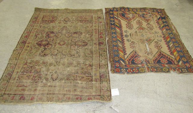 Heavily worn and damaged, largest is 3'10 x 5'7. Heavily worn and damaged, largest is 3'10 x 5'7.