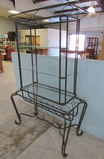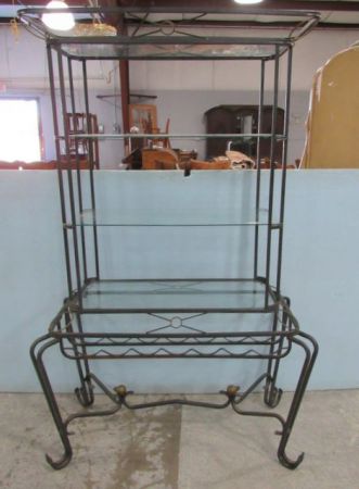 Four glass shelves, bottom wine rack, 69"h., 43"w., 23"d. Four glass shelves, bottom wine rack, 69"h., 43"w., 23"d.