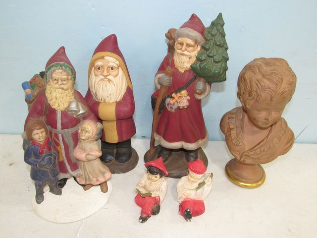 Three hand painted ceramic Santa's 10"h., Borghese resin bust 9"h., Two small Asian ceramic boy and girl. Three hand painted ceramic Santa's 10"h., Borghese resin bust 9"h., Two small Asian ceramic boy and girl.