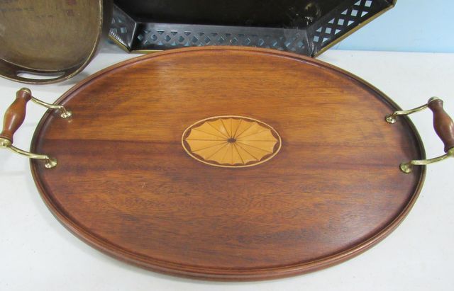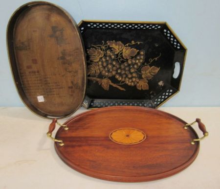 Black Nasco hand painted tray (has paint chips) 24"w., Asian wood oval tray 17"w., Handcrafted by Frank Burrows 1995 French Style tray, brass handles, brass footed, 22"w. Black Nasco hand painted tray (has paint chips) 24"w., Asian wood oval tray 17"w., Handcrafted by Frank Burrows 1995 French Style tray, brass handles, brass footed, 22"w.
