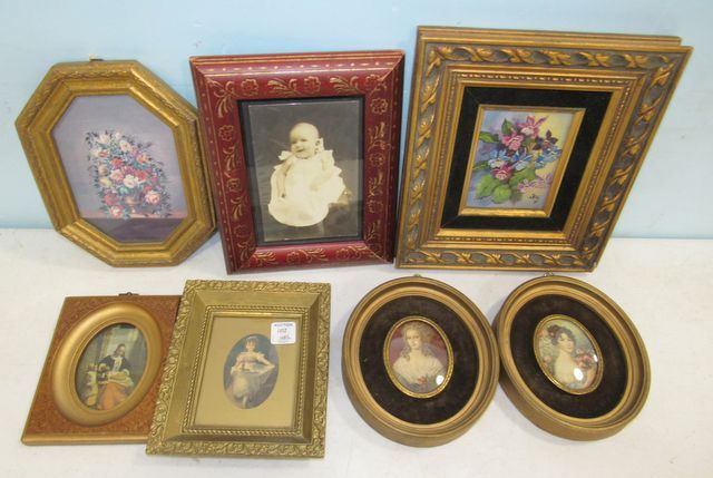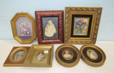 Two round oval framed ladies 7"h., Oil on board Painting of Flowers by Joy 10"h., 9"w., framed picture of baby, polygon framed floral print 9"h., gold framed girl and small framed picture of lady and child. Two round oval framed ladies 7"h., Oil on board Painting of Flowers by Joy 10"h., 9"w., framed picture of baby, polygon framed floral print 9"h., gold framed girl and small framed picture of lady and child.