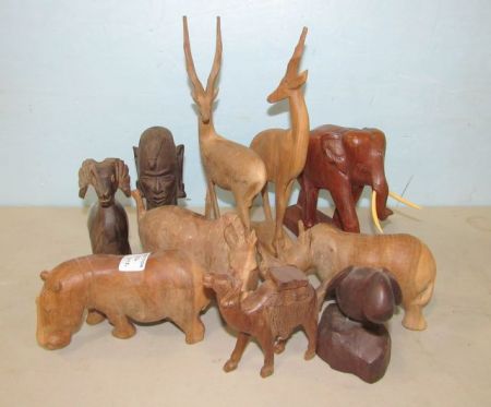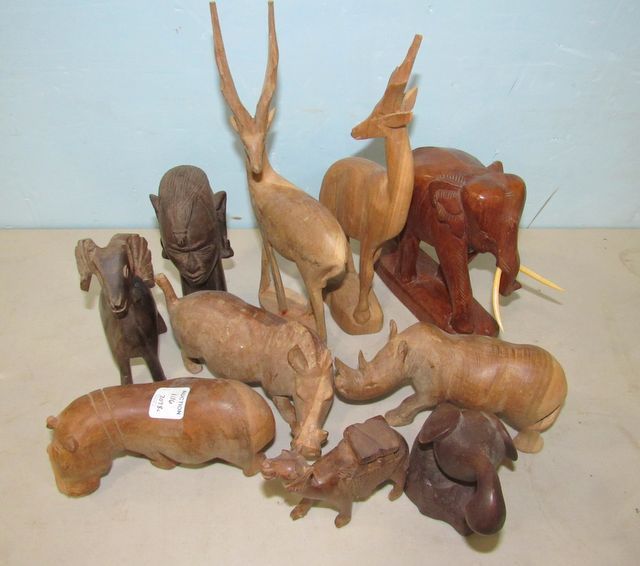 Goose, India carved elephant 7"h., rhino (chip on horn), ram (horns chipped), camel, Warthog, hippo, gazelle (one has broken horn). Goose, India carved elephant 7"h., rhino (chip on horn), ram (horns chipped), camel, Warthog, hippo, gazelle (one has broken horn).