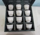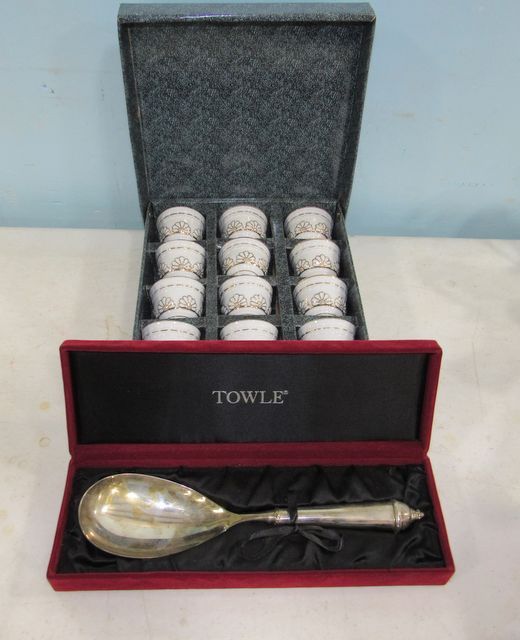 Twelve porcelain cups, 11" Towle spoon. Twelve porcelain cups, 11" Towle spoon.