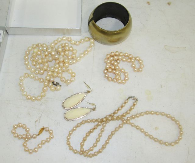 Faux Pearl bracelet Monet, Two Necklaces (one with silver clasp), Monet choker, and Brass tone cuff bracelet, cream earrings. Faux Pearl bracelet Monet, Two Necklaces (one with silver clasp), Monet choker, and Brass tone cuff bracelet, cream earrings.