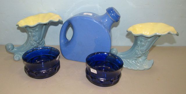 Two Red Wing Cornucopia Horn Vases 6"h., glazed blue pottery jug, Kings Crown Cobalt Blue Glass Thumbprint Dishes Bowls. Two Red Wing Cornucopia Horn Vases 6"h., glazed blue pottery jug, Kings Crown Cobalt Blue Glass Thumbprint Dishes Bowls.
