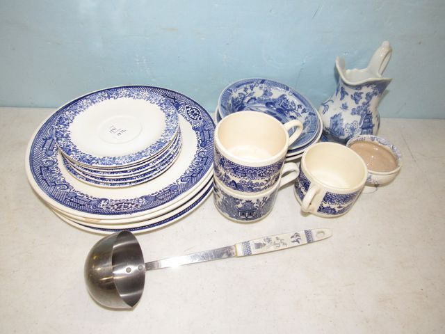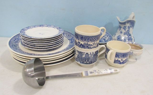 Six blue and white saucers, five blue and white dinner plates, three mugs, water pitcher. Six blue and white saucers, five blue and white dinner plates, three mugs, water pitcher.