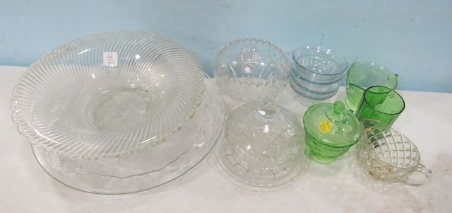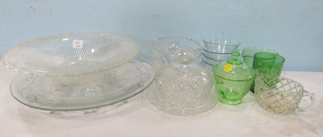 Green glass sugar, creamer, cup, etched bowl, light blue bowls, etched glass covered dish, two glass under plates, swirl glass bowl 12"dia. Green glass sugar, creamer, cup, etched bowl, light blue bowls, etched glass covered dish, two glass under plates, swirl glass bowl 12"dia.