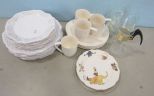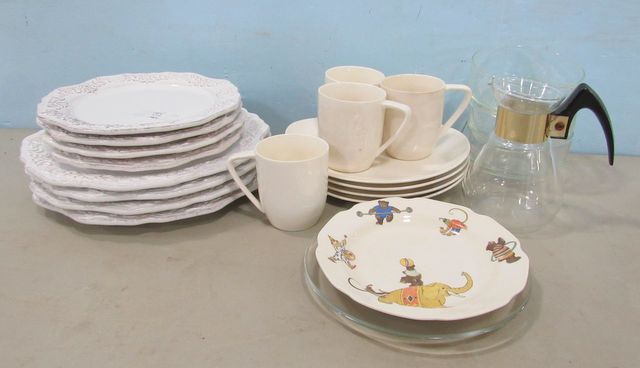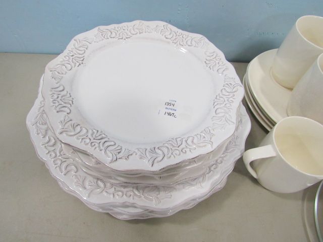 Four white dinner plates, four white salad plates, four pottery lunch plates with four mugs, glass pitcher, plates, three bowls. Four white dinner plates, four white salad plates, four pottery lunch plates with four mugs, glass pitcher, plates, three bowls.