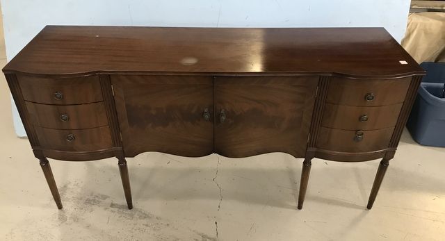 Strong Box Furniture Sheraton Style Buffet, flame mahogany, inlaid trim, double door storage, 6 side drawers, has minor swirls and white spot on top, 34"h., 66"w., 17"d. Strong Box Furniture Sheraton Style Buffet, flame mahogany, inlaid trim, double door storage, 6 side drawers, has minor swirls and white spot on top, 34"h., 66"w., 17"d.