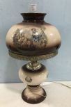 Vintage Hand Painted Globe Lamp, English Man and Woman scenery, brown and white porcelain, hurricane shade, 21"h. Vintage Hand Painted Globe Lamp, English Man and Woman scenery, brown and white porcelain, hurricane shade, 21"h.