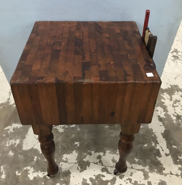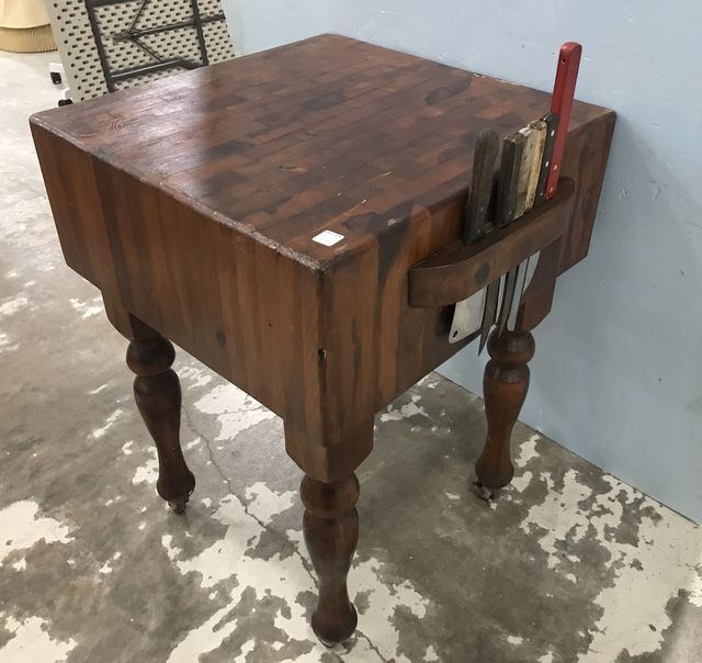 Heavy Solid Butcher's Block, on wheels, has knife holders, 33"h., 24"w. Heavy Solid Butcher's Block, on wheels, has knife holders, 33"h., 24"w.