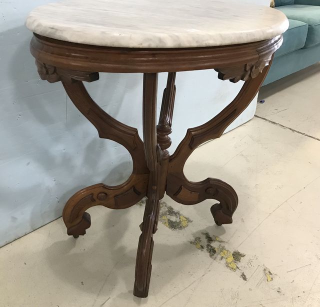 Flame Mahogany Victorian Ca. 1860 Oval Marble Top Table, with turnings, on casters, small nic in bottom marble, 29"h., 29"w. Flame Mahogany Victorian Ca. 1860 Oval Marble Top Table, with turnings, on casters, small nic in bottom marble, 29"h., 29"w.