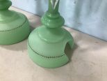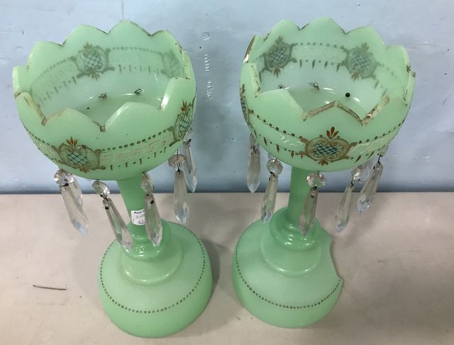 Pair of Vintage hand Painted Lusters, waterfall crystal prisms, one has piece missing on base, 14"h. Pair of Vintage hand Painted Lusters, waterfall crystal prisms, one has piece missing on base, 14"h.