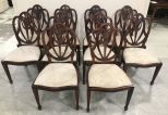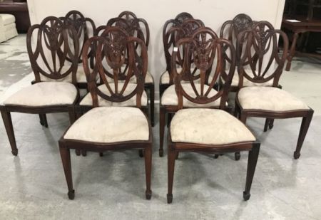 12 Antique Reproduction Sheraton Style Dinning Chair, carved crest, mahogany, 8 side chairs, two need tightening, the fabric seats are dirty needs cleaning or re upholstery, wood is in good shape, 40"h. 12 Antique Reproduction Sheraton Style Dinning Chair, carved crest, mahogany, 8 side chairs, two need tightening, the fabric seats are dirty needs cleaning or re upholstery, wood is in good shape, 40"h.