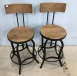 Pair of Industrial Style Bar Stools, black frame, adjustable seat, wood back and wood, 40"h. Pair of Industrial Style Bar Stools, black frame, adjustable seat, wood back and wood, 40"h.