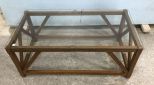 Modern Wood Coffee Table, metal support stretchers, glass top rectangle, 19"h., 47"w., 24"d. Modern Wood Coffee Table, metal support stretchers, glass top rectangle, 19"h., 47"w., 24"d.
