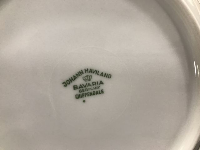 Johann Haviland Bavaria "Chippendale" China Set, Germany, 12 dinner plates, 12 desert plates, 12 salad bowls (one has rim chip), 12 berry bowls, 24 saucers, 12 cups, creamer, sugar, 3 servers platters. Johann Haviland Bavaria "Chippendale" China Set, Germany, 12 dinner plates, 12 desert plates, 12 salad bowls (one has rim chip), 12 berry bowls, 24 saucers, 12 cups, creamer, sugar, 3 servers platters.