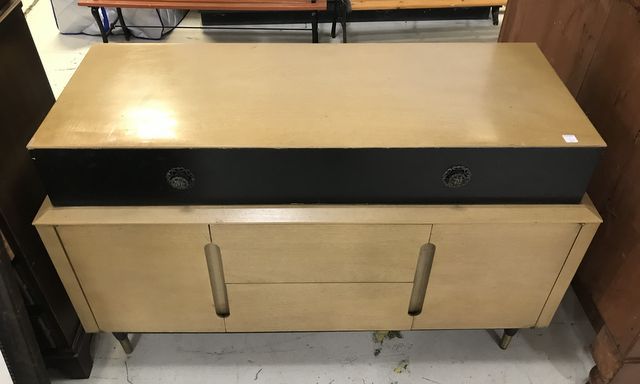 Basic Witz Company Mid Century Style Server, black painted top drawer with flatware tray, double doors, two center drawers, footed, 31"h., 47"w., 18"d. Basic Witz Company Mid Century Style Server, black painted top drawer with flatware tray, double doors, two center drawers, footed, 31"h., 47"w., 18"d.