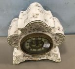 French Style Porcelain Mantle Clock, has cracks, hand painted floral, brass and glass instruments, 12"h., 9"w. French Style Porcelain Mantle Clock, has cracks, hand painted floral, brass and glass instruments, 12"h., 9"w.