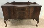 Burl Mahogany Queen Anne Style Buffet, carved back splash, two door storage, three center drawers, has scratches on finish, 36"h., 56"w., 31"d. Burl Mahogany Queen Anne Style Buffet, carved back splash, two door storage, three center drawers, has scratches on finish, 36"h., 56"w., 31"d.