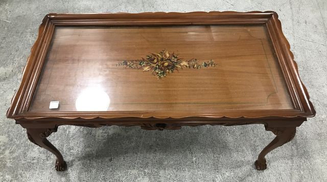 Vintage French Style Coffee Table, mahogany, with glass serving tray, floral painting center, some finish wear, 17"h., 34"w., 1682BMPOJ Vintage French Style Coffee Table, mahogany, with glass serving tray, floral painting center, some finish wear, 17"h., 34"w., 1682BMPOJ