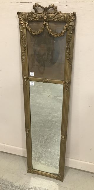 French Gold Gilt Trumeau Mirror, "Le Depart Du Courier, ornate carvings, Men print in top section, 52"h., 13"w. French Gold Gilt Trumeau Mirror, "Le Depart Du Courier, ornate carvings, Men print in top section, 52"h., 13"w.
