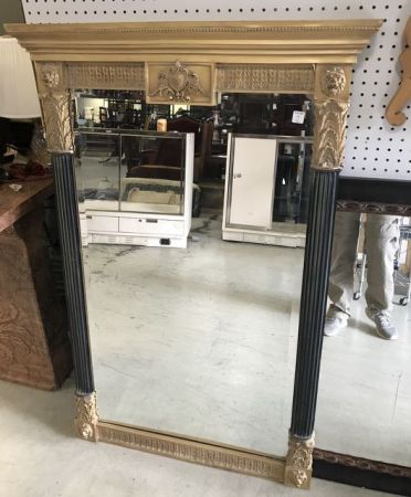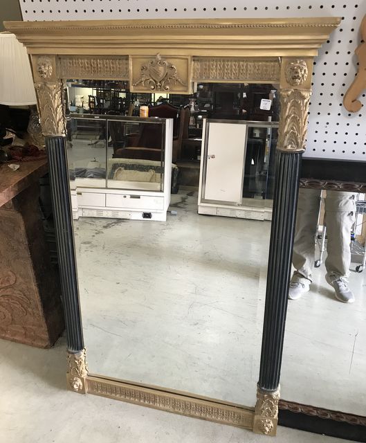 Modern Empire Style Wall Mirror, beveled mirror, lion head emblems, decor piece, 33"h., 50"w., 1650BMPDJ. Modern Empire Style Wall Mirror, beveled mirror, lion head emblems, decor piece, 33"h., 50"w., 1650BMPDJ.