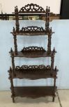 Victorian Style Etagere, five display shelves, finials, mahogany, ornate crests, 56"h., 22"w. Victorian Style Etagere, five display shelves, finials, mahogany, ornate crests, 56"h., 22"w.