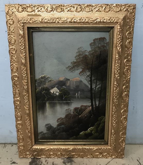 Oil Painting of Swiss Alps Scene, on board, ornate gold framed, 31"h., 23"w. Oil Painting of Swiss Alps Scene, on board, ornate gold framed, 31"h., 23"w.