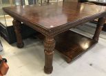 Ornate designs oak banded dinning table, inlaid trim top, large carved legs, modern decor, legs are removable, two leaves, 30"h., 72"long., 45"w. Ornate designs oak banded dinning table, inlaid trim top, large carved legs, modern decor, legs are removable, two leaves, 30"h., 72"long., 45"w.