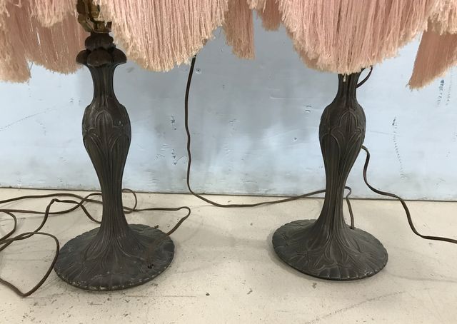 Pair of Ornate Metal French Style Lamps, antiqued style metal design, unique shades, 30"h. Pair of Ornate Metal French Style Lamps, antiqued style metal design, unique shades, 30"h.