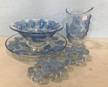 Blue flower glass punch bowl with under plate, vase, pair of candle holders. Blue flower glass punch bowl with under plate, vase, pair of candle holders.