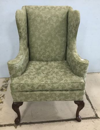 Queen Anne Green Satin Down Filled Wing back Chair, good condition, 43"h. Queen Anne Green Satin Down Filled Wing back Chair, good condition, 43"h.