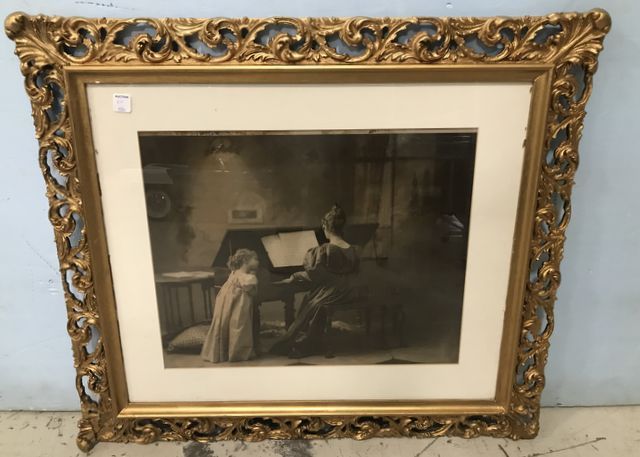 Photo of Piano Lady Print Ca. 1910, square gold gilt framed, 29"h., 33"w. Photo of Piano Lady Print Ca. 1910, square gold gilt framed, 29"h., 33"w.