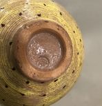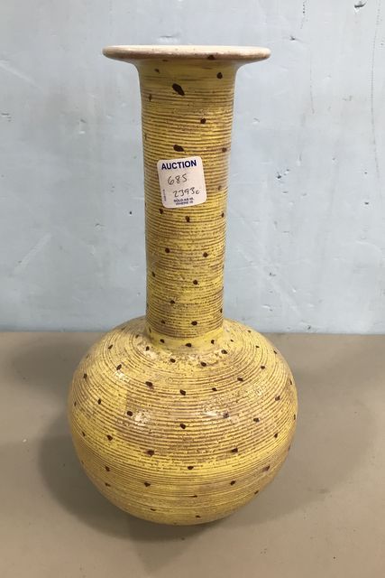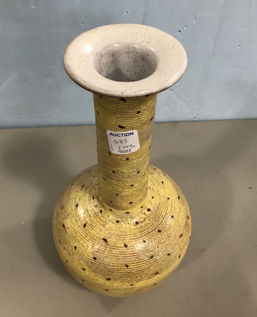 Hand Painted Long Neck Pottery Vase, yellow with black dots, Chinese mark, 12"h. Hand Painted Long Neck Pottery Vase, yellow with black dots, Chinese mark, 12"h.