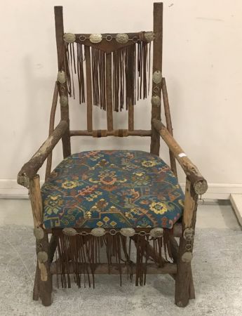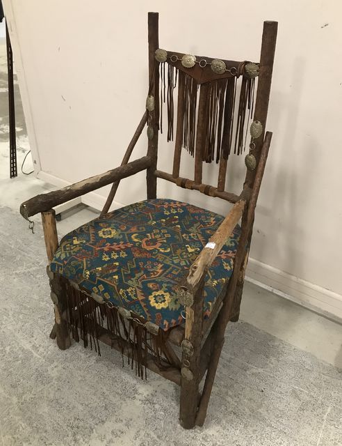 Hand Made Western Cedar Chair, Western leather and emblem decor, fabric seat, 45"h. Hand Made Western Cedar Chair, Western leather and emblem decor, fabric seat, 45"h.
