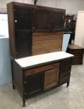 Vintage Two Piece Hoosier Cabinet, on wheels, two piece, storage doors, needs work in spots, 71"h., 48"w., 27"d. Vintage Two Piece Hoosier Cabinet, on wheels, two piece, storage doors, needs work in spots, 71"h., 48"w., 27"d.