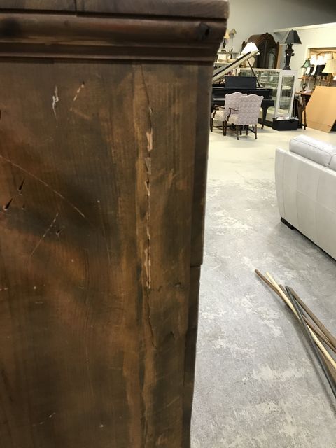 Tall Pine Chest of Drawers, 7 drawers, white pulls, missing one, has split on side panel, has some scratches, all drawers work well, 60"h., 35"w., 18"d. Tall Pine Chest of Drawers, 7 drawers, white pulls, missing one, has split on side panel, has some scratches, all drawers work well, 60"h., 35"w., 18"d.