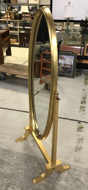 Modern Gold Gilt Cheval Mirror, oval mirror, designer piece, 60"h. Modern Gold Gilt Cheval Mirror, oval mirror, designer piece, 60"h.