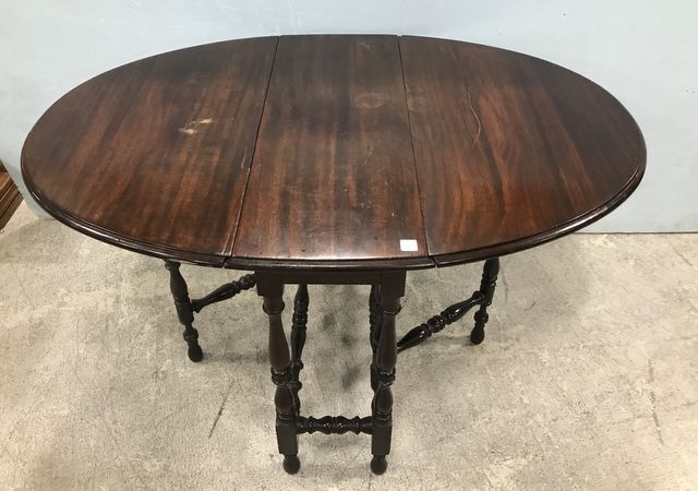 Vintage Gate Leg Oval Table, drop leaf table, has scratches on finish, dark stain, 30"h., 48"w., 34"d. Vintage Gate Leg Oval Table, drop leaf table, has scratches on finish, dark stain, 30"h., 48"w., 34"d.