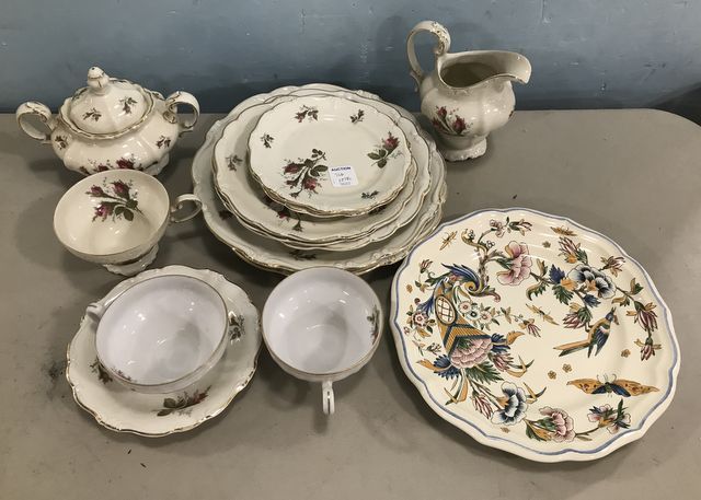 Rosenthal "Pompadour" China Set, 2 dinner plates, 1 salad, 3 desserts, sugar, creamer, cups, miscellaneous pieces are bondware cups, Gien France hand painted plate. Rosenthal "Pompadour" China Set, 2 dinner plates, 1 salad, 3 desserts, sugar, creamer, cups, miscellaneous pieces are bondware cups, Gien France hand painted plate.