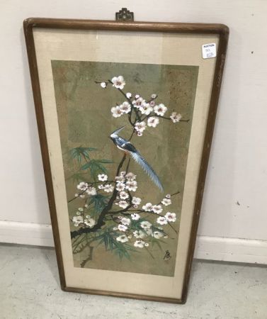 Watercolor on Hand Made Cork Paper, Chinese, Bird, framed, 31"h., 15"w. Watercolor on Hand Made Cork Paper, Chinese, Bird, framed, 31"h., 15"w.