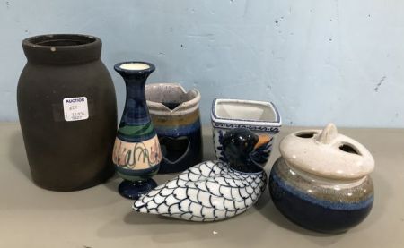 Blue and white duck, pottery stoneware jars, Gail Pittman bud vase, small potter crock, blue and white vase. Blue and white duck, pottery stoneware jars, Gail Pittman bud vase, small potter crock, blue and white vase.