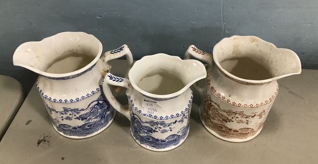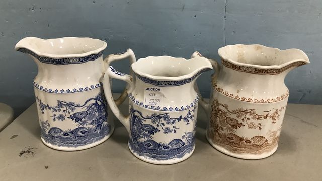 Furnivals Quail Porcelain Mugs, three, made in England, 1913, 6"h. Furnivals Quail Porcelain Mugs, three, made in England, 1913, 6"h.