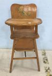 Vintage Child's High Chair, light wood, tray, painted back, 37"h. Vintage Child's High Chair, light wood, tray, painted back, 37"h.