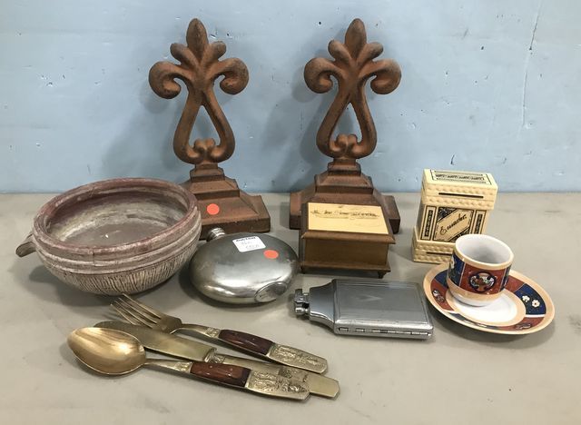 Group of collectibles, metal book ends, pottery bowl, lighter, flask, demi tasse cup and saucer, brass flatware, plastic case, music box. Group of collectibles, metal book ends, pottery bowl, lighter, flask, demi tasse cup and saucer, brass flatware, plastic case, music box.